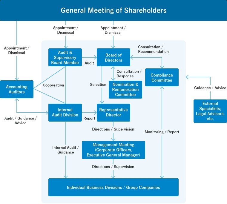 • In line with the basic approach to corporate governance outlined above, Fuji Electric Engineering & Construction chooses to be a Company with an Audit & Supervisory Board, believing that separating management supervision and monitoring from business execution functions, and having Audit & Supervisory Board Members and an Audit & Supervisory Board, who are independent of the Board of Directors, perform appropriate supervision and monitoring functions by exercising their independent information-gathering capabilities, will contribute to achieving compliance.